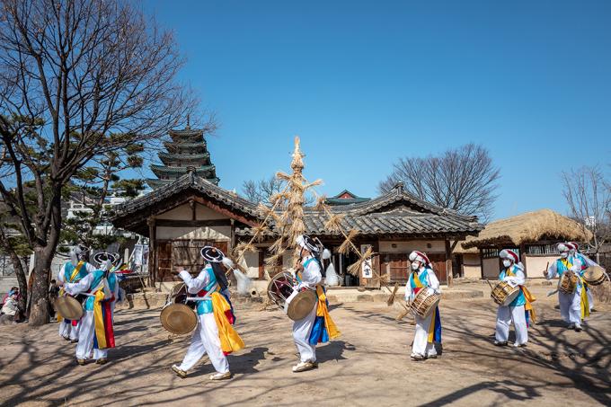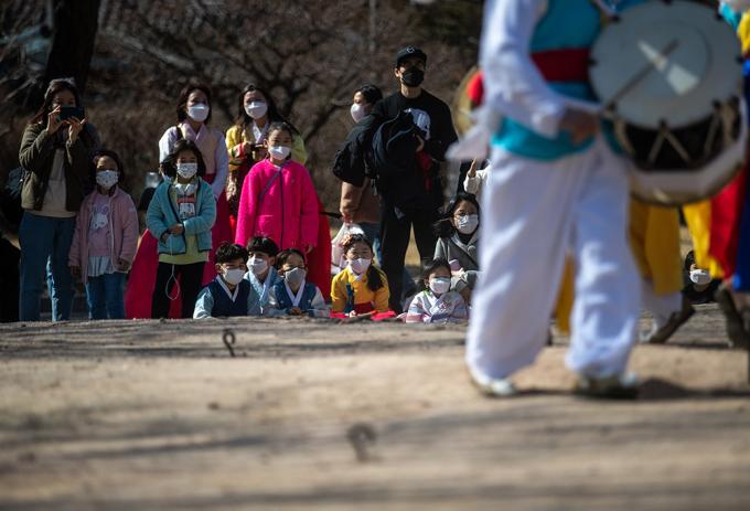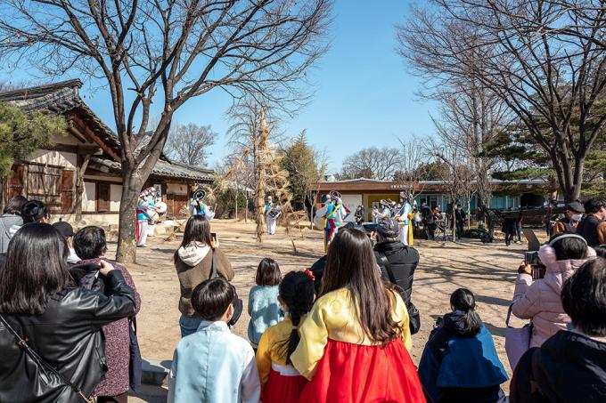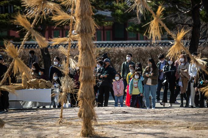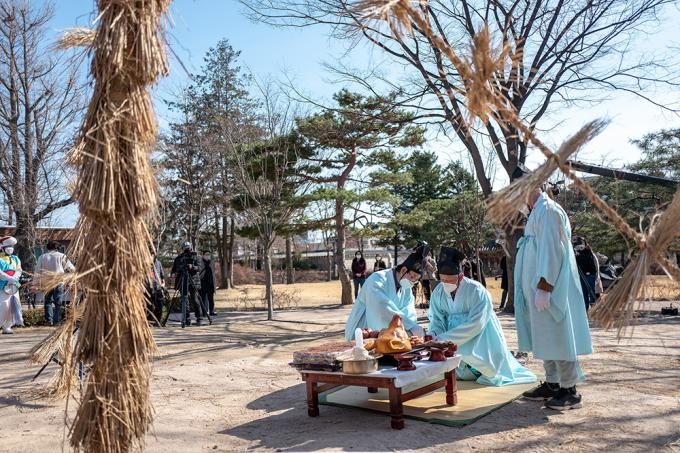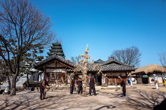 26일 오후 서울 종로구 국립민속박물관에서 정월대보름을 맞아 '볏거리대 세우기' 행사가 열리고 있다. 볏가리대 세우기는 정월대보름에 짚이나 헝겊에 벼, 보리, 조, 기장 등 갖가지 곡식을 싸서 볏가릿대에 높이 매달아 세워놓고 1년 농사의 풍요를 기원하는 풍속이다.