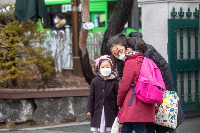 2021학년도 첫 등교를 시작한 2일 오전 서울 강남구 서울포이초등학교에서 학생들이 엄마와 인사하고 있다.