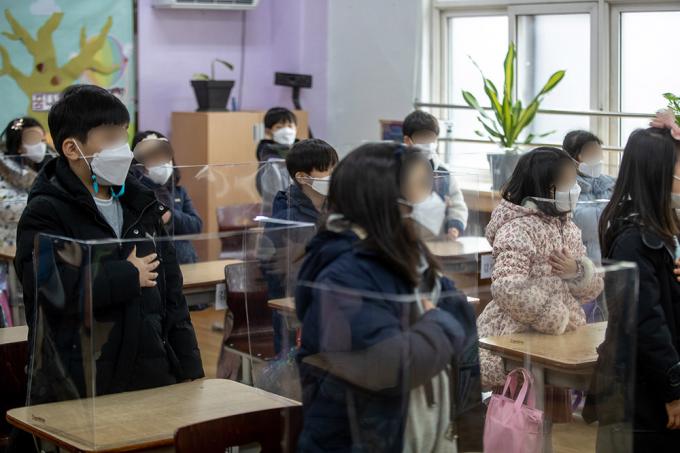 2021학년도 첫 등교를 시작한 2일 오전 서울 강남구 서울포이초등학교에서 열린 시업식에서 학생들이 국민의례를 하고 있다.