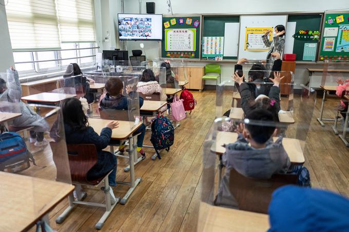2021학년도 첫 등교를 시작한 2일 오전 서울 강남구 서울포이초등학교에서 열린 시업식에서 학생들이 인사를 하고있다.