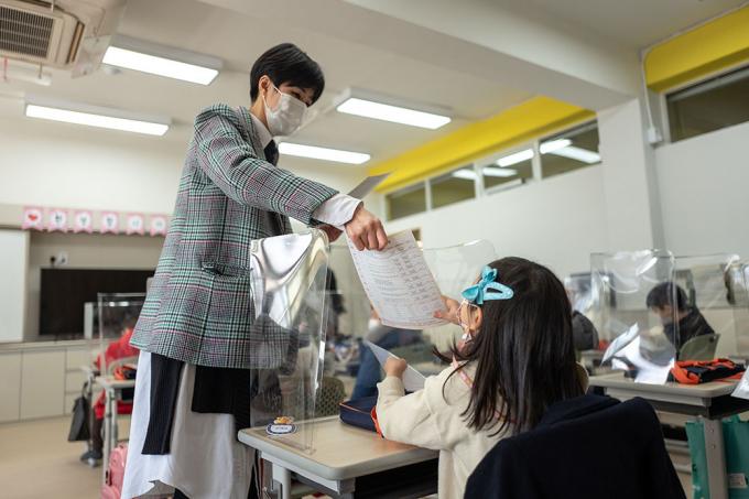 2일 오전 서울 강남구 서울포이초등학교에서 1학년 담임선생님이 학생들에게 안내문을 나눠주고 있다.