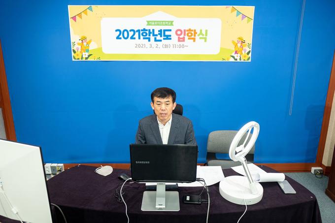 정환용 서울포이초등학교 교장이 2일 오전 서울 강남구 서울포이초등학교에서 열린 입학식에서 인사말을 하고 있다.