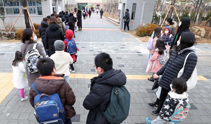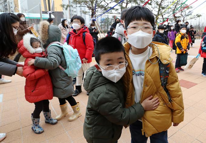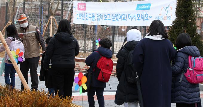 2021학년도 초·중·고교 신학기 첫 등교가 시작된 2일 오전 서울 강동구 강빛초등학교에서 열린 입학식에서 1학년 신입생들이 줄을 서고 있다.[사진공동취재단]