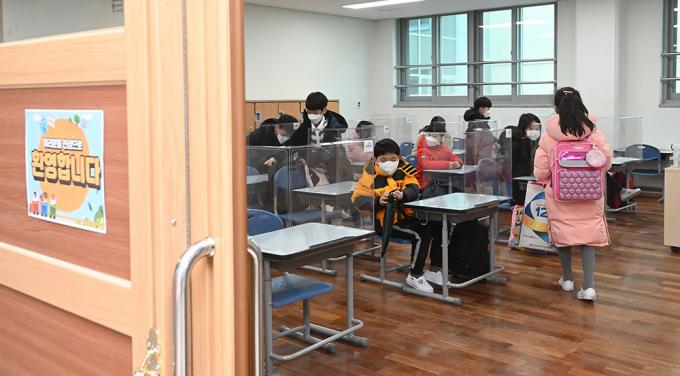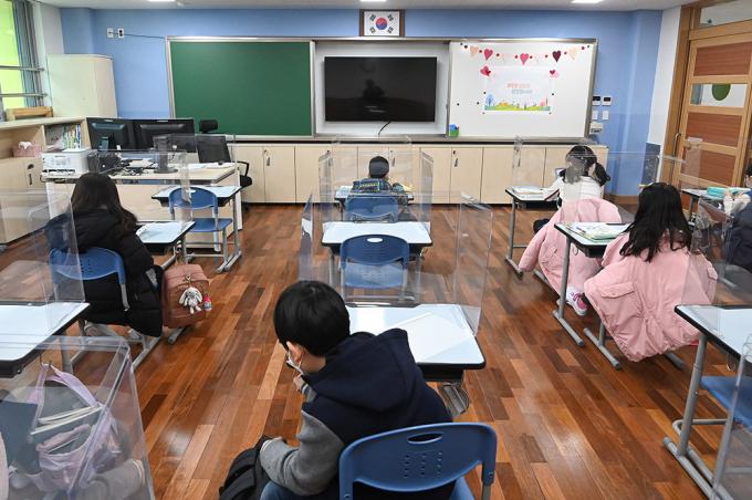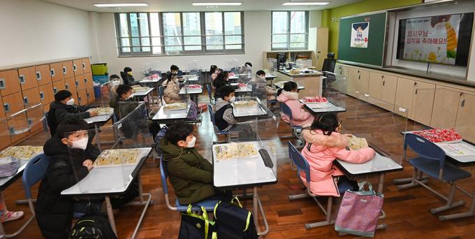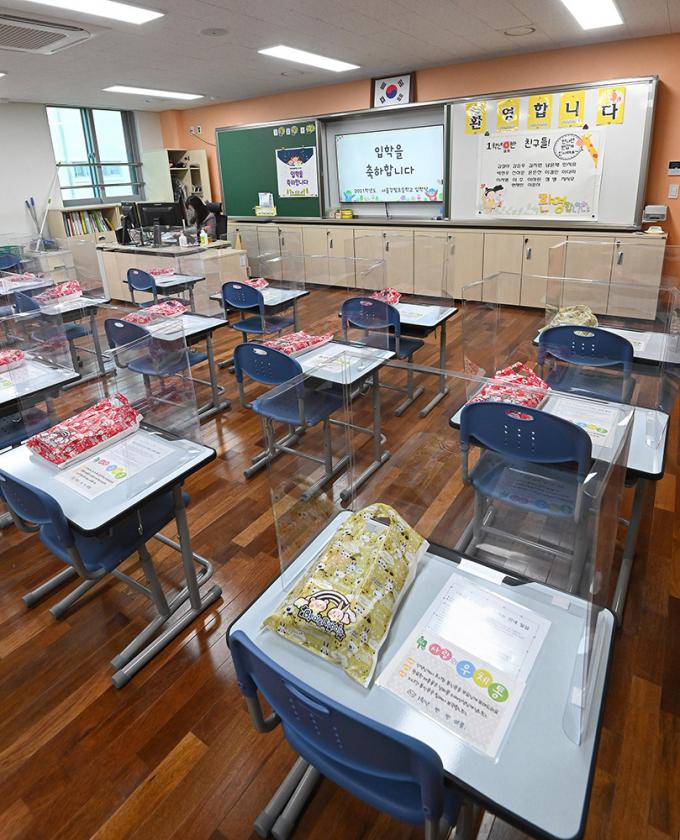 전국적으로 개학이 시작된 1일 오전 서울 강동구 강빛초중이음학교에서 초등학생들이 자리에 앉아 대기하고 있다.[사진공동취재단]