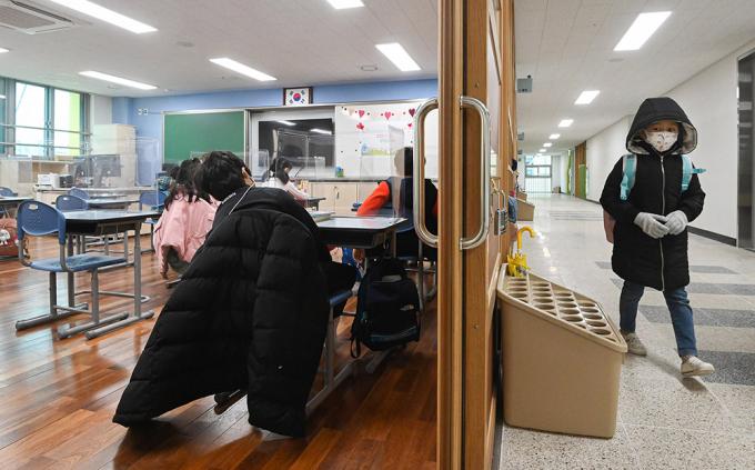 전국적으로 개학이 시작된 1일 오전 서울 강동구 강빛초중이음학교에서 초등학생이 교실로 이동하고 있다.[사진공동취재단]