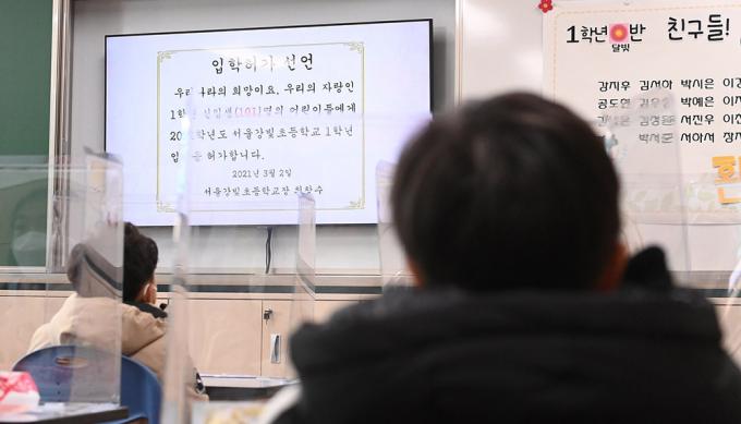 전국적으로 개학이 시작된 1일 오전 서울 강동구 강빛초중이음학교에서 초등학생들이 영상을 통해 입학식을 하고 있다.[사진공동취재단]