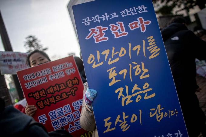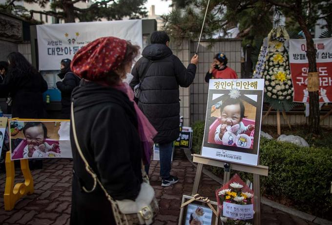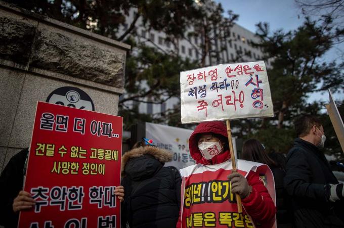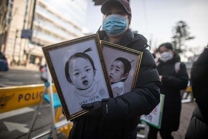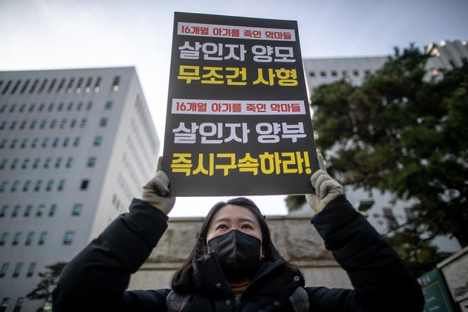 양부모 학대로 숨진 '정인이 사건' 3차 공판이 열린 3일 오전 서울 양천구 남부지방법원 앞에서 시민들이 양부모의 법정 최고형을 촉구하는 피켓을 들고 잇다.