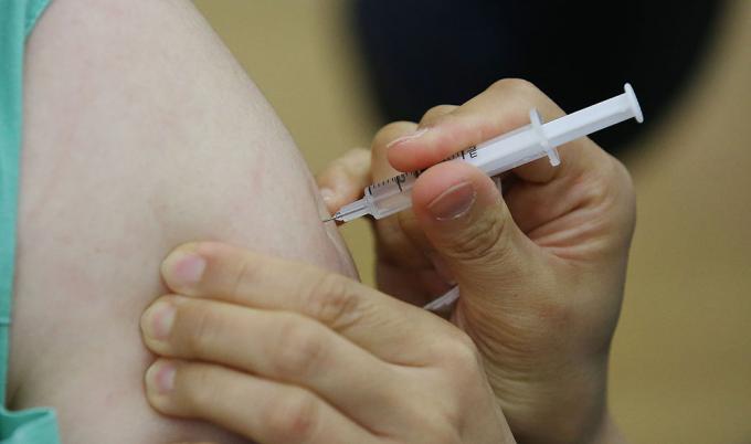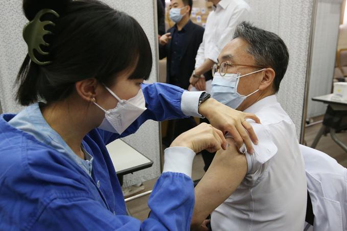정승용 서울대학교병원부원장이 4일 오전 서울 종로구 서울대어린이병원 임상강의실에서 아스트라제네카(AZ) 코로나19 백신 1차 접종을 하고 있다. [사진공동취재단]