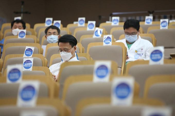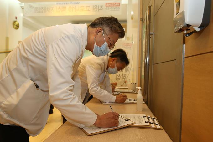김연수 서울대학교병원장 등 의료진들이 4일 오전 서울 종로구 서울대어린이병원 임상강의실에서 아스트라제네카(AZ) 코로나19 백신 1차 접종을 위해 예진표 작성을 하고 있다. [사진공동취재단]
