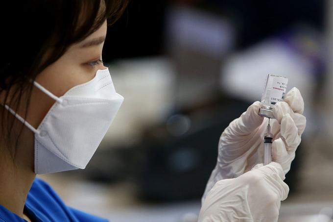 4일 오전 서울 종로구 서울대어린이병원 임상강의실에서 의료진이 아스트라제네카(AZ) 코로나19 백신 1차 접종을 위해 소분하고 있다. [사진공동취재단]