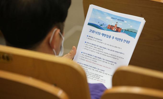 4일 오전 서울 종로구 서울대어린이병원 임상강의실에서 아스트라제네카(AZ) 코로나19 백신 1차 접종을 한 의료진이 이상반응 안내문을 읽고 있다. [사진공동취재단]
