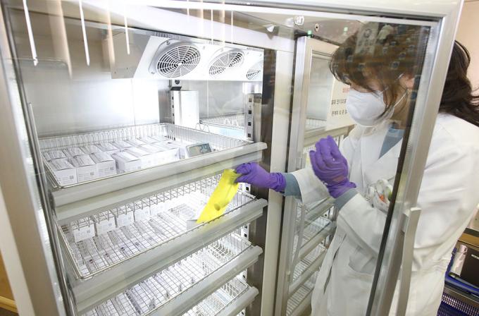 4일 오전 서울 종로구 서울대어린이병원 임상강의실에서 의료진이 아스트라제네카(AZ) 코로나19 백신 1차 접종을 위해 백신 전용 냉장고에서 백신을 꺼내고 있다. [사진공동취재단]