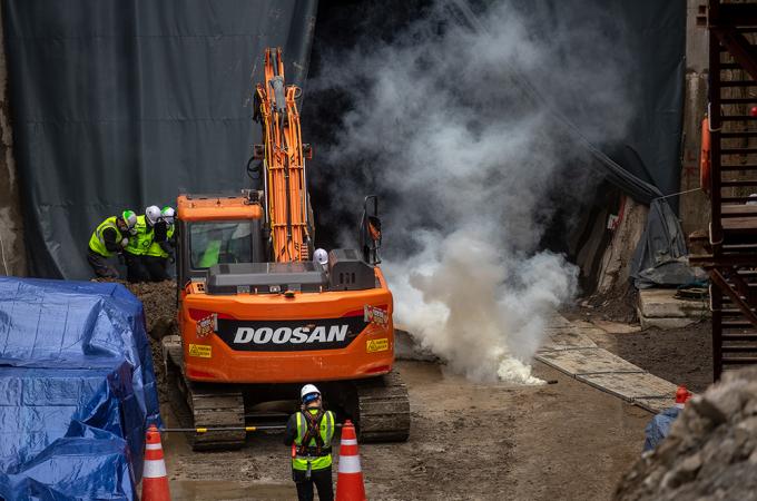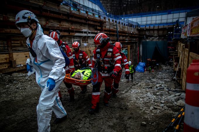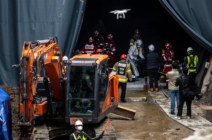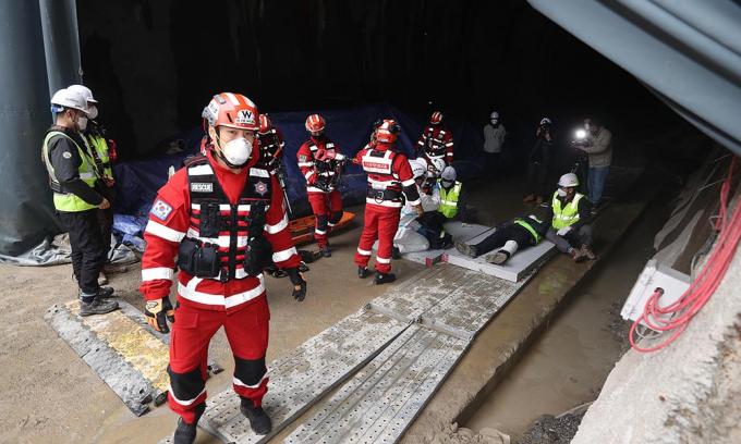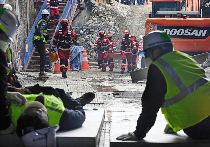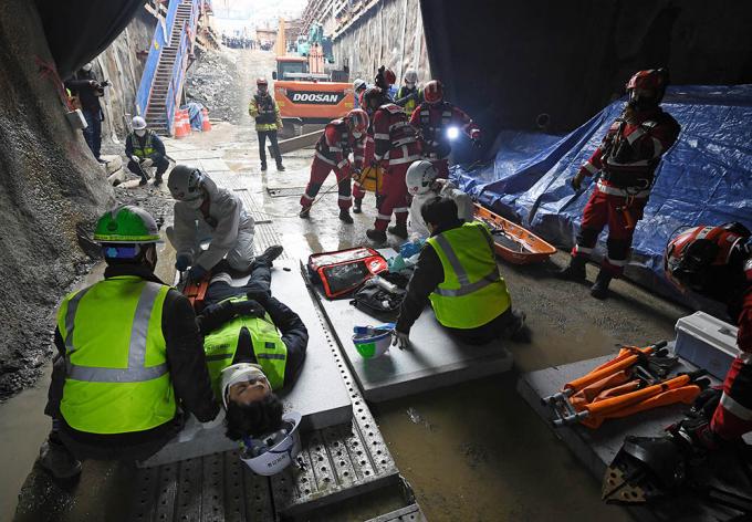 4일 해빙기를 대비해 반포천 유역분리터널 건설 현장에서 터널 공사장 흙막이 붕괴 상황을 가장한 모의훈련을 실시하고 있다. 모의훈련이 실시되는 반포천 유역분리터널 건설현장은 강남역 일대 침수 피해를 예방하기 위한 시설물로, 해빙기에 접어들면 붕괴 위험이 커지는 흙막이 가시설이 설치된 공사장이다.
