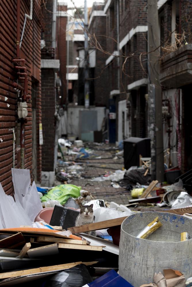 4일 오후 서울 성동구 용답동 재개발 철거지역. 원주민들이 모두 떠난 골목에 길고양이가 애처롭게 앉아 있다.
