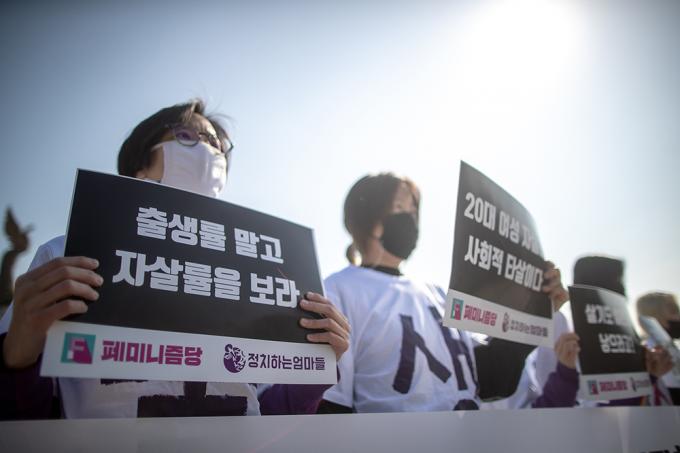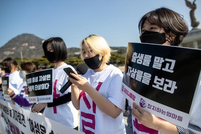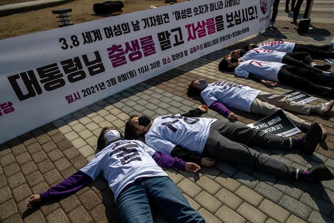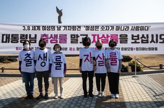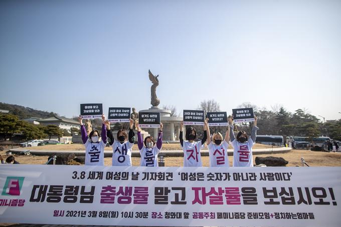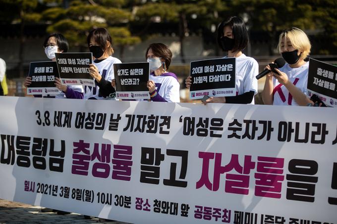 정치하는엄마들, 페미니즘당 창당모임 회원 및 관계자들이 8일 오전 서울 종로구 청와대 사랑채 앞 분수대에서 3.8 세계 여성의 날 기자회견을 열고 '대통령님 출생률 말고 자살률을 보십시오'라고 적힌 배너를 펼쳤다. 이들은 기자회견에서 "20대 청년 여성 자살률이 43% 급증했다"며 "국가가 감히 출생률 운운해서는 안 되고, 20대 여성의 죽음에 주목하고 죽음의 행렬을 막기 위한 노력부터 해야한다"고 주장했다.
