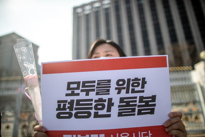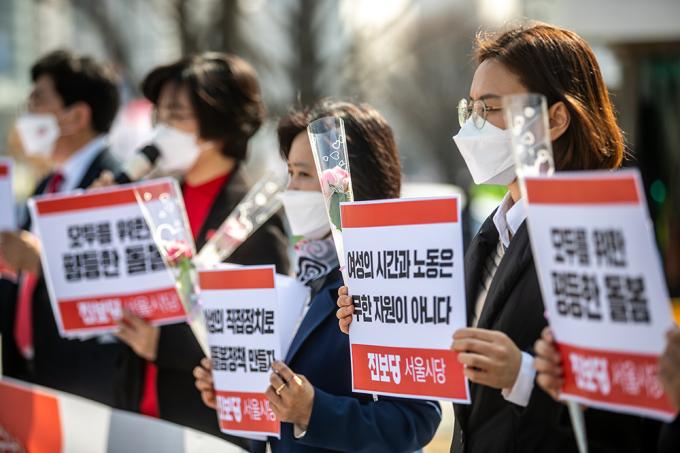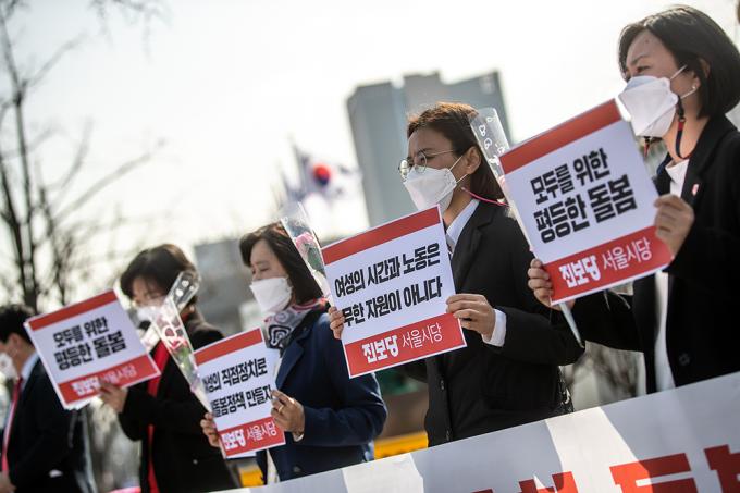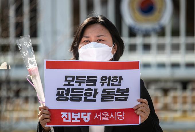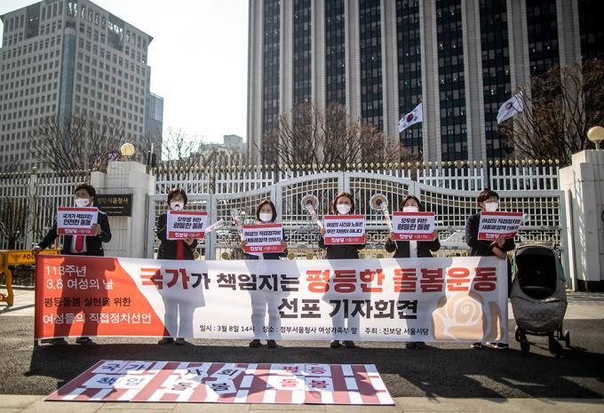 진보당 서울시당이 8일 오후 서울 종로구 정부서울청사 앞에서 국가가 책임지는 평등한 돌봄 실현을 위한 여성직접정치를 선언하는 평등한 돌봄운동 선포 기자회견을 하고 있다.