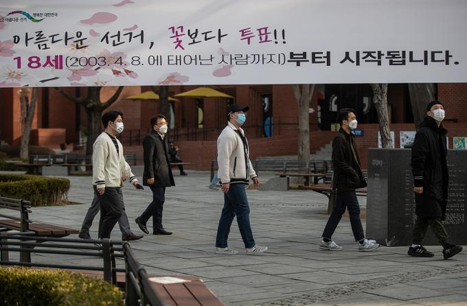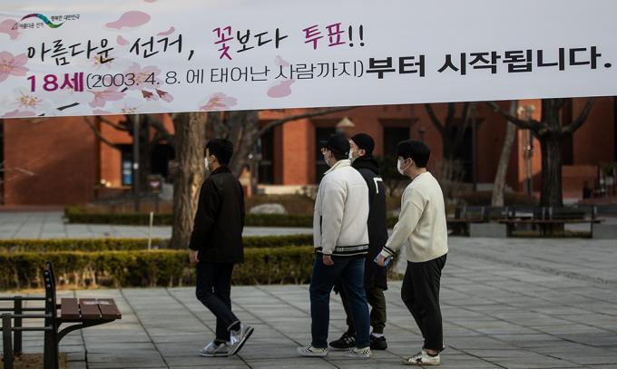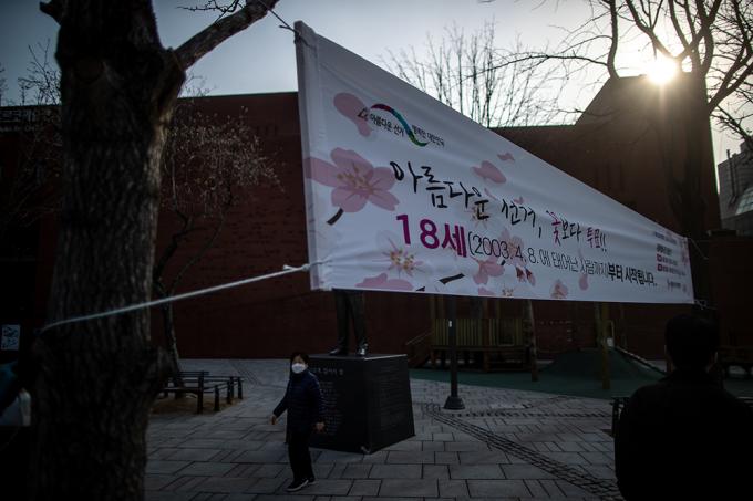9일 오전 서울 종로구 마로니에공원에 18세 이상 선거권 확대를 홍보하는 현수막이 설치돼있다. 서울특별시선거관리위원회는 오는 4·7 재보궐선거에 유권자들의 투표 참여를 독려하기 위해 홍보활동을 벌이고 있다.