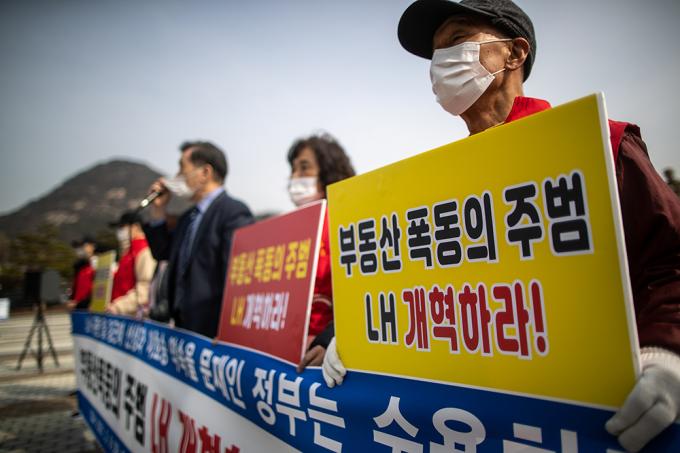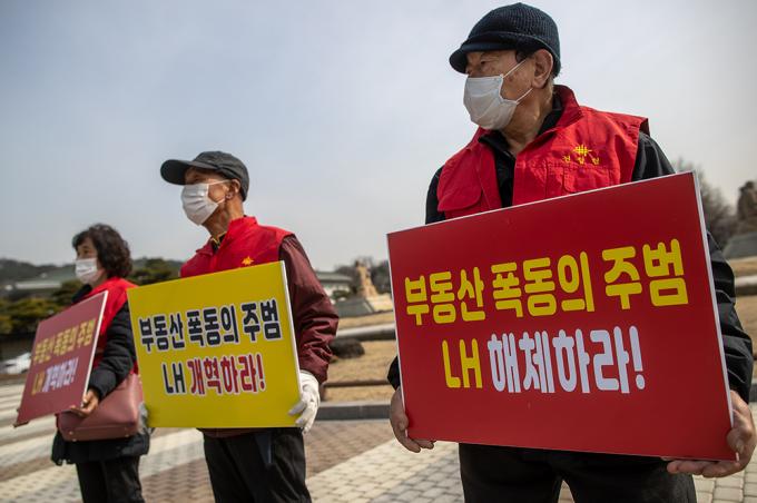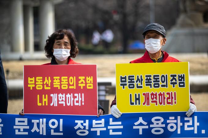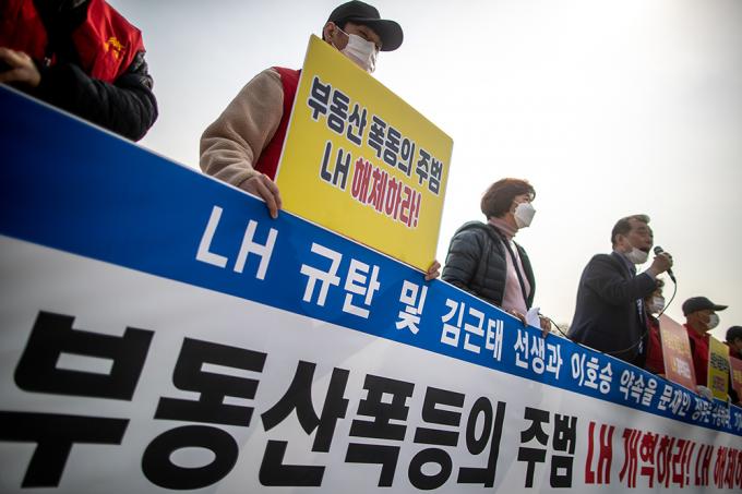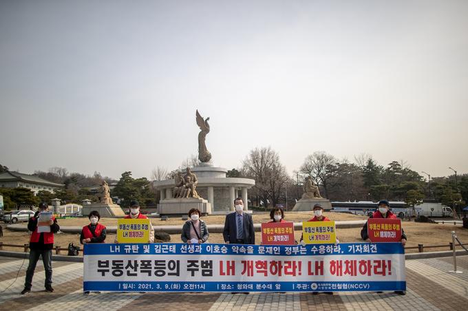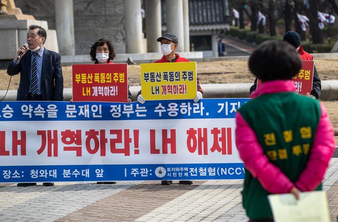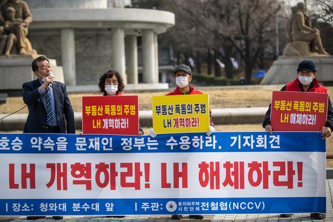 LH 직원들의 부동산 투기 의혹 문제가 확산되는 가운데 9일 오전 서울 종로구 청와대사랑채 앞 분수대에서 전국철거민협의회 회원 및 관계자들이 기자회견을 열고 부동산 폭등의 주범, 한국토지주택공사에 대한 개혁과 해체를 촉구하고 있다.