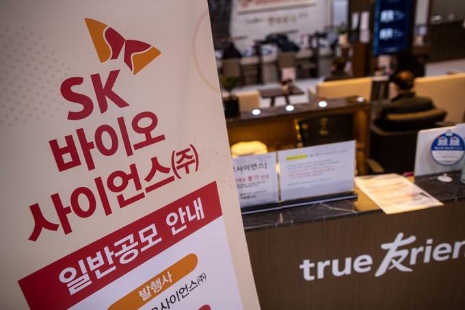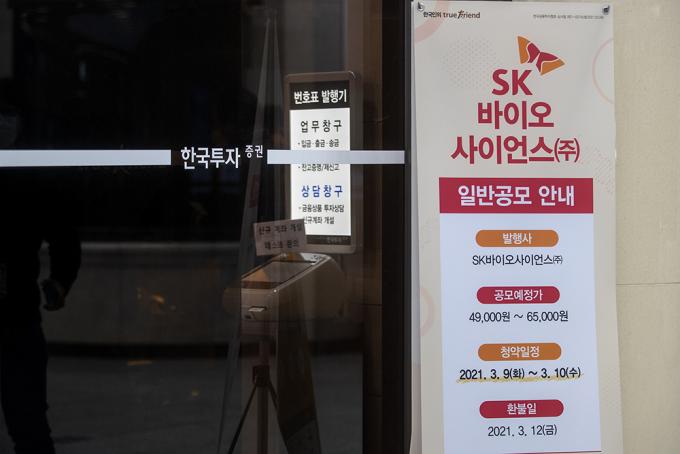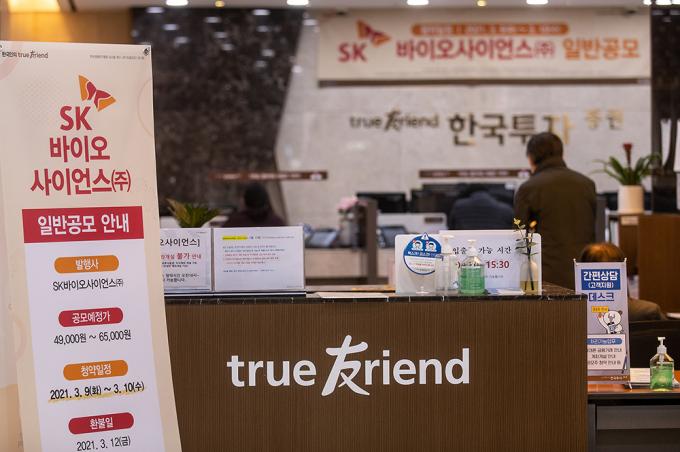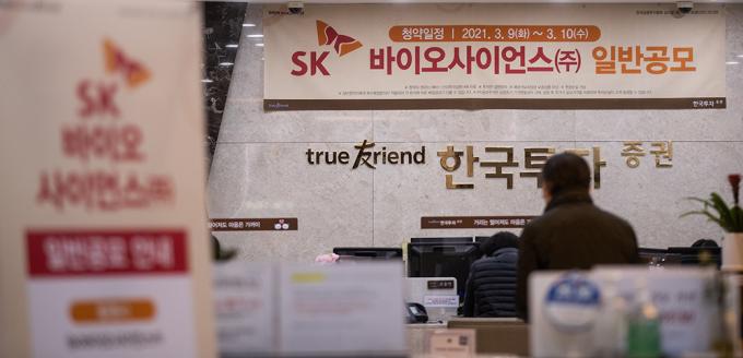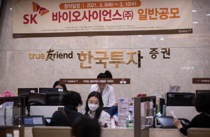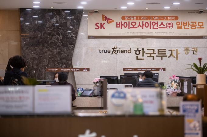 올해 상반기 기업공개(IPO) '대어'로 꼽히는 SK바이오사이언스의 일반 투자자 대상 공모주 청약이 시작된 9일 서울 영등포구 한국투자증권 영업부가 분주하다. 코로나19 백신 아스트라제네카를 위탁 생산하면서 높은 관심을 받고 있는 SK바이오사이언스의 일반 공모 청약은 10일까지 진행되며, 공모가는 6만5000원으로 확정됐다.