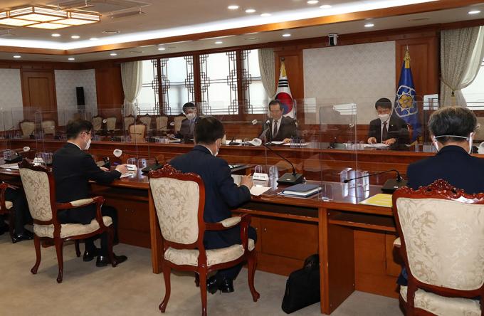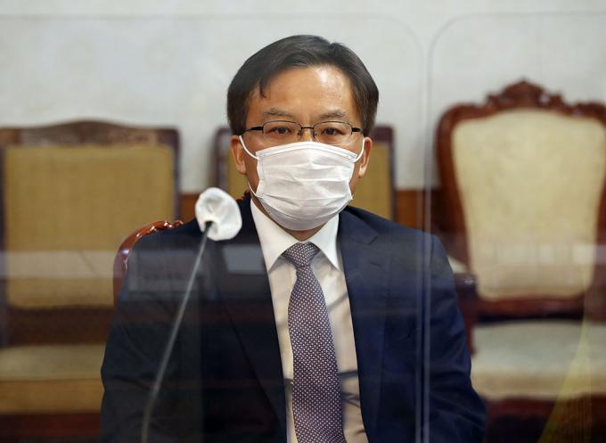 조남관 검찰총장 직무대행이 10일 오전 서울 종로구 정부서울청사에서 열린 신도시 투기의혹 수사협력 관련 회의에 참석하고 있다.