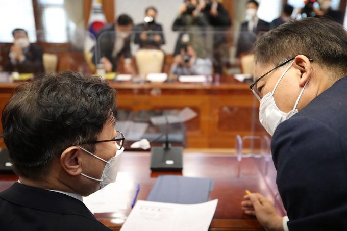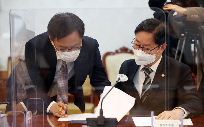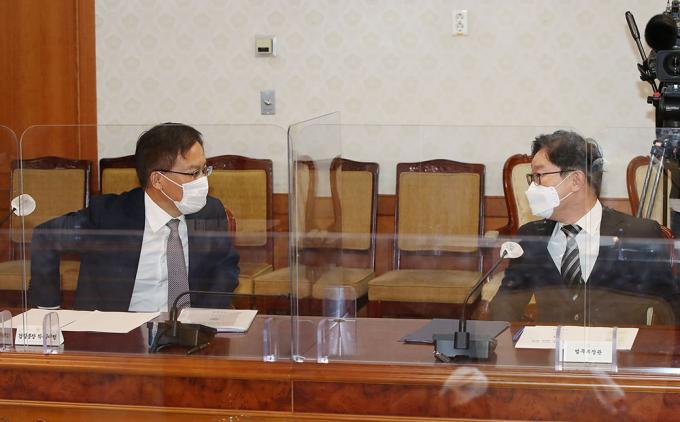 박범계 법무부 장관과 조남관 검찰총장 직무대행이 10일 오전 서울 종로구 정부서울청사에서 열린 신도시 투기의혹 수사협력 관련 회의에 참석해 대화하고 있다.