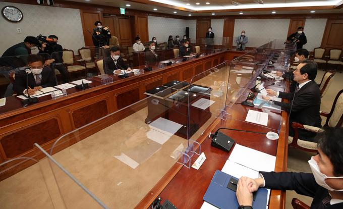 정세균 국무총리가 10일 오전 서울 종로구 정부서울청사에서 엘에이치(LH) 신도시 투기의혹 수사협력 관련 회의에서 발언을 마친 뒤 회의 재개를 기다리고 있다.