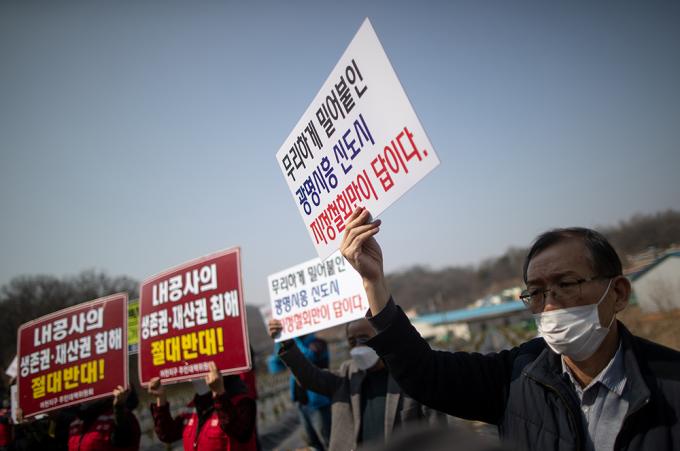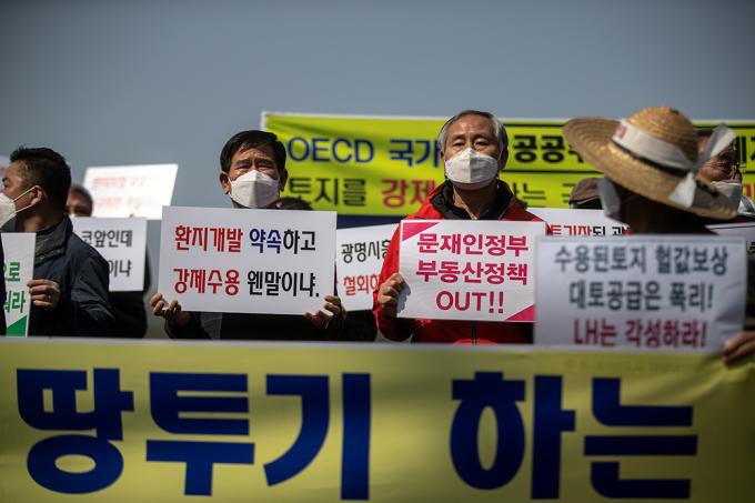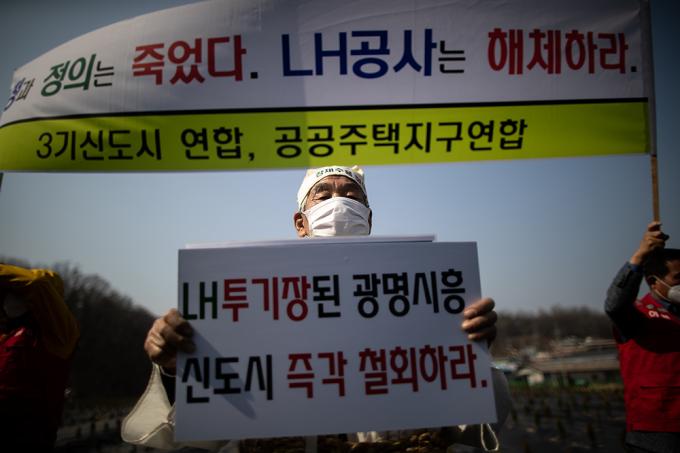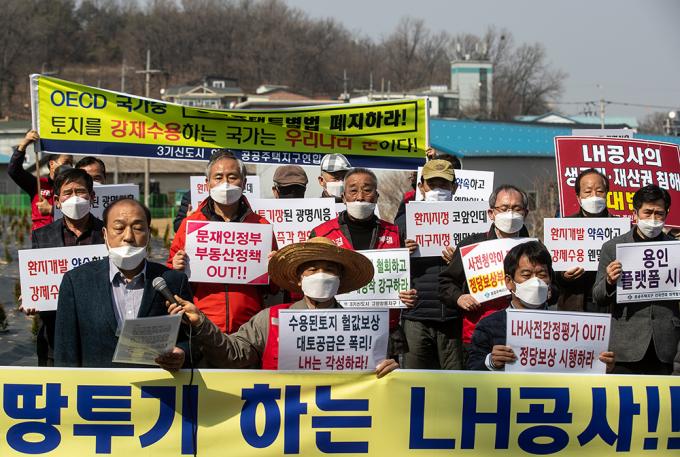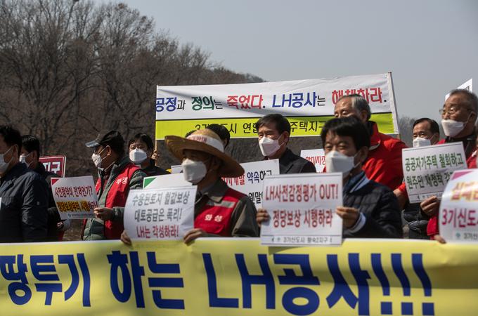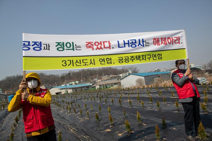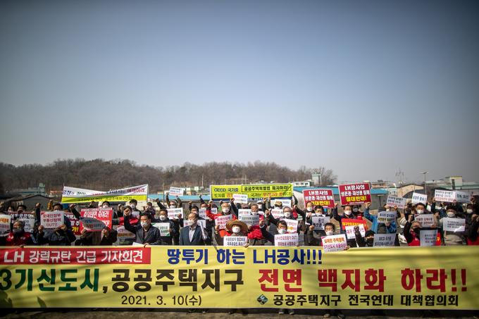 공공주택지구 전국연대 대책협의회의 각 지역 대표자와 주민들이 10일 오후 경기 시흥시 과림동 LH직원 투기 의혹 토지 앞에서 LH를 규탄하며 3기 신도시 백지화와 공공주택특별법 폐지를 촉구하고 있다.