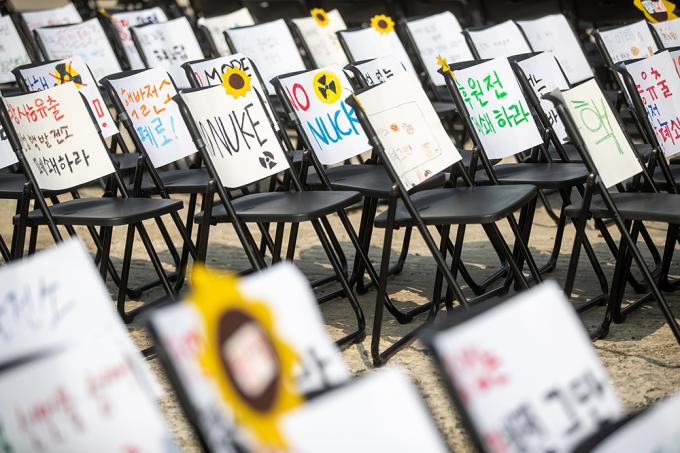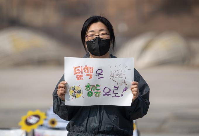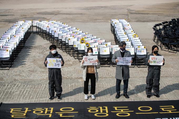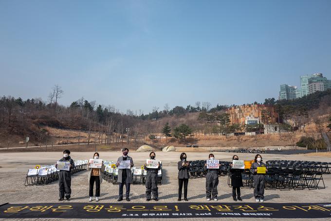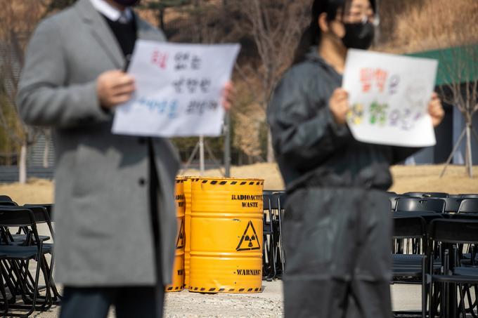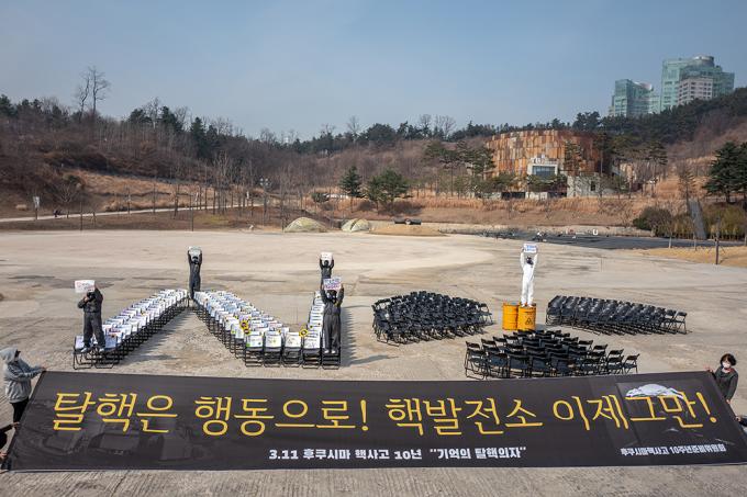환경운동연합 등 환경단체로 구성된 후쿠시마핵사고 10주년준비위원회 관계자들이 11일 서울 마포구 문화비축기지에서 기자회견을 열고 "후쿠시마 핵사고를 기억하고 정부는 핵 없는 세상을 위해 행동하라"고 요구하고 있다.