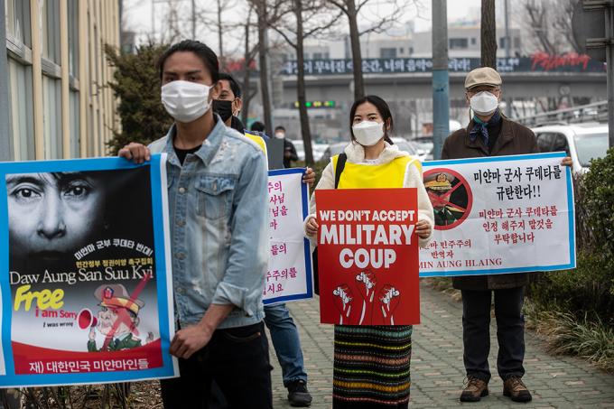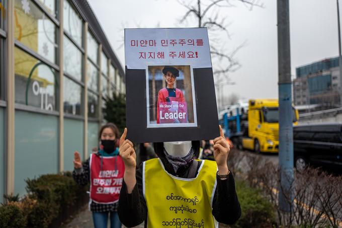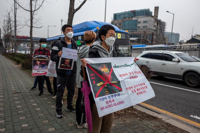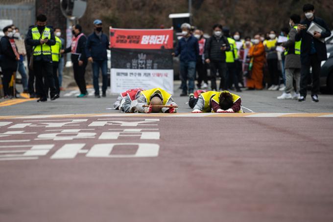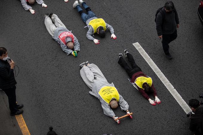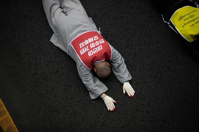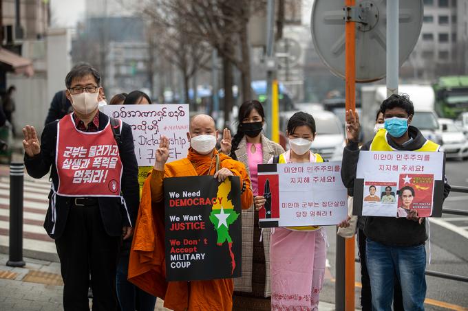 대한불교조계종 사회노동위원회 및 재한 미얀마인들이 12일 오후 서울 용산구 미얀마 대사관 앞에서 폭력과 살생을 자행하는 미얀마 군부를 규탄하는 기자회견을 마친 뒤 UN인권위원회 서울사무소로 오체투지를 하고 있다.