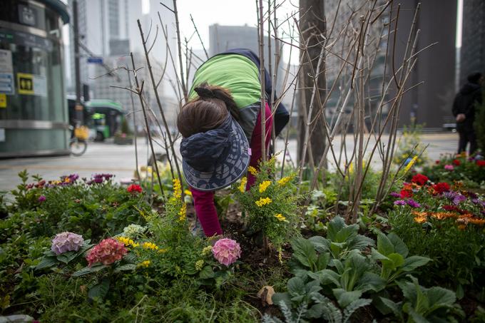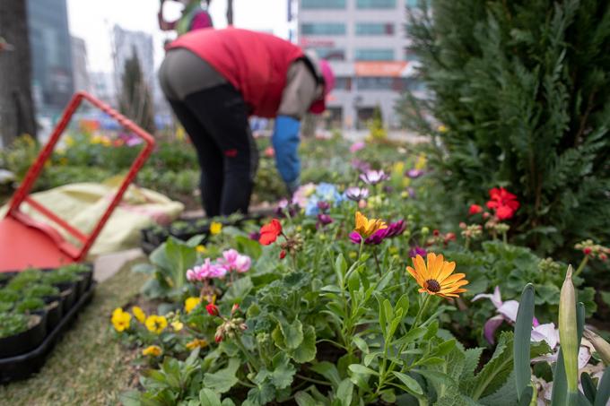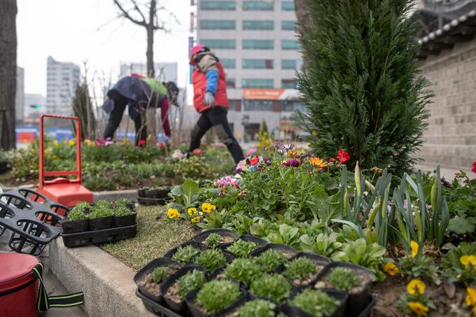 코로나19가 일상을 옥죄는 삶이 계속되고 있지만 계절은 무심한 듯 옷을 갈아입고 있다. 어느새 꽃샘추위도 없이 완연한 봄날 기온으로 움츠린 어깨가 펴지는 계절이다. 15일 오전 서울 덕수궁 앞 화단에서 서울시 관계자들이 봄꽃을 식재하고 있다.