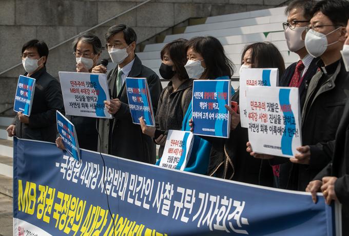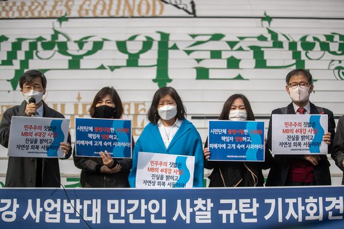 이들은 이날 기자회견에서 "이명박 정부 국정원에서 4대강 사업을 강행하기 위해 벌였던 불법 민간인 사찰이 구체적인 문서로 드러났다"면서 "민주주의를 짓밟은 4대강 사업의 본질을 꿰뚫고 4대강 재자연화와 피해자들에 대한 피해 회복을 위해 수단을 강구할 것"을 촉구했다.