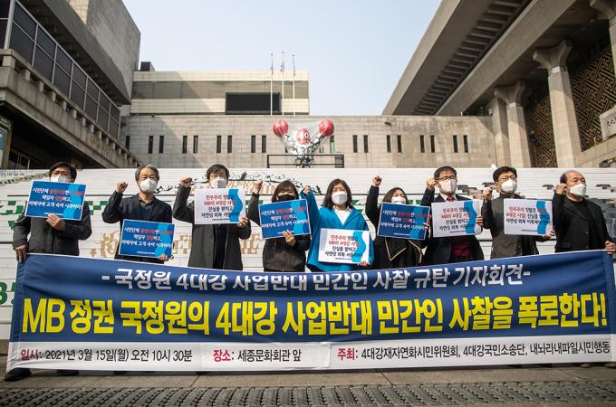 4대강재자연화시민위원회, 내놔라내파일시민행동 등 환경단체 관계자들이 15일 오전 서울 종로구 세종문화회관 계단에서 'MB 국정원의 4대강 사업반대 민간인 사찰 폭로' 기자회견을 하고 있다.