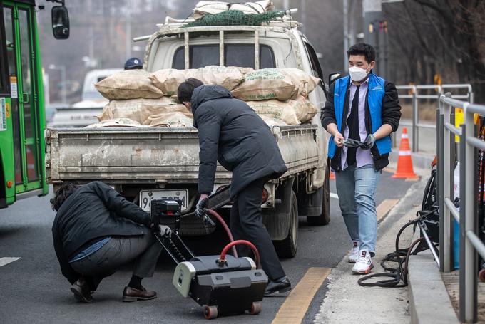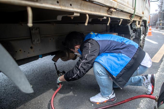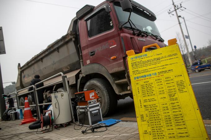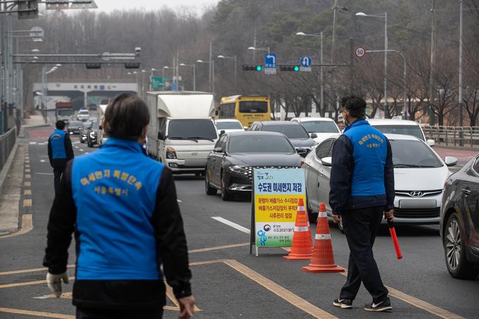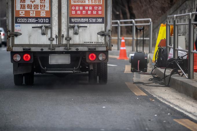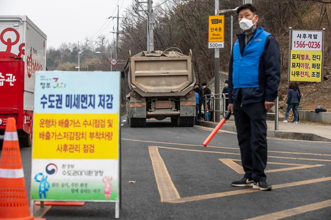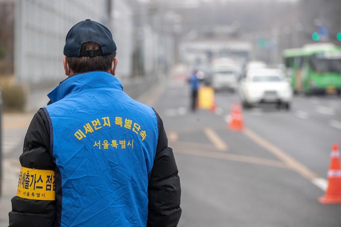 서울, 인천, 경기, 충남 지역에 미세먼지 비상저감조치가 시행 중인 15일 서울 양천구 신정로 인근에서 미세먼지 비상저감조치와 관련해 서울시 관계자가 배출가스 저감장치 부착 등을 단속하고 있다. 환경부가 이날 새벽 6시부터 수도권과 충남 지역에 '고농도 미세먼지 비상저감조치'를 시행하면서 배출가스 5등급인 차량의 운행은 금지됐다.