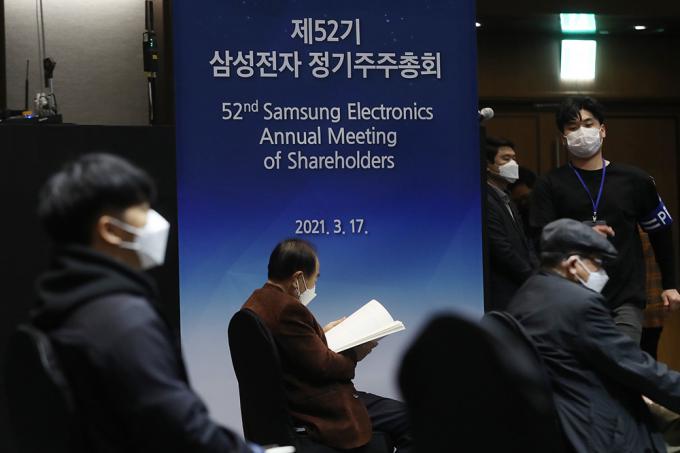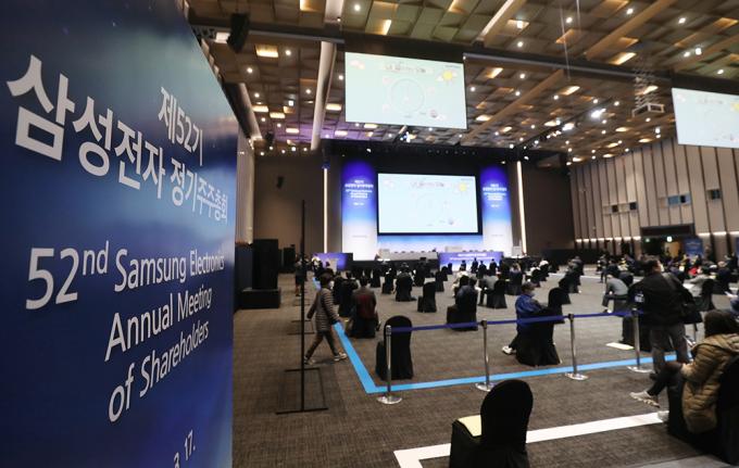 7일 오전 경기 수원시 수원컨벤션센터에서 제52기 삼성전자 정기주주총회가 온·오프라인 병행으로 열리고 있다.