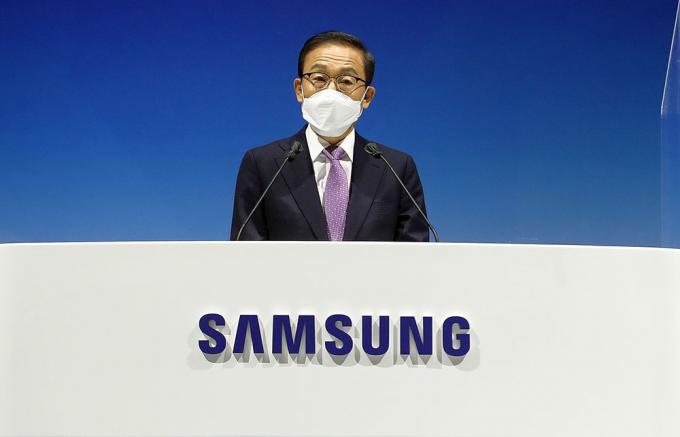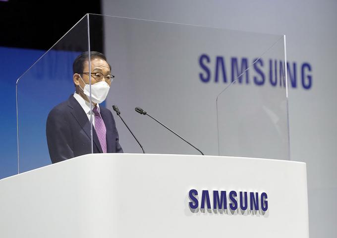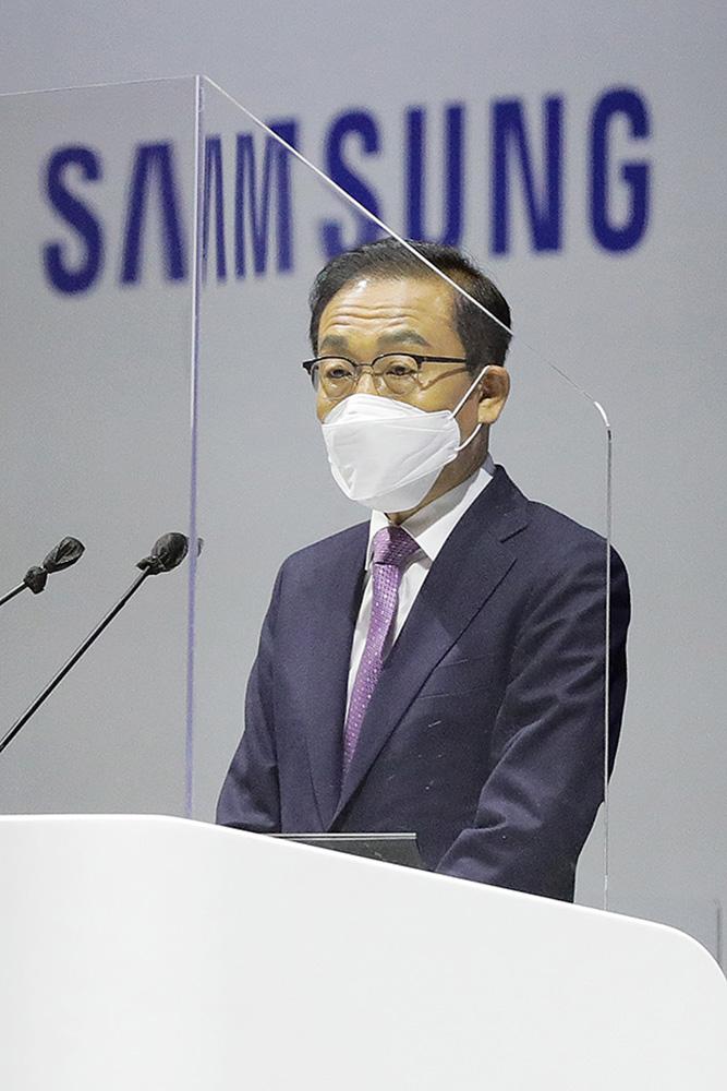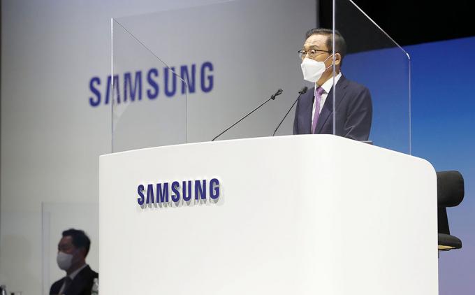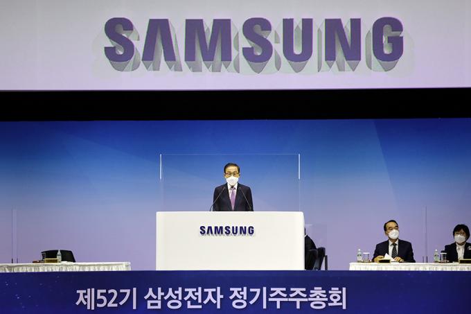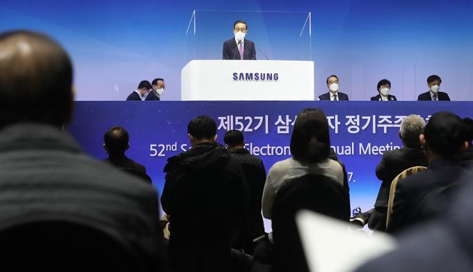 김기남 삼성전자 대표이사 부회장이 17일 경기 수원시 수원컨벤션센터에서 열린 제52기 삼성전자 정기주주총회에서 인사말을 하고 있다.