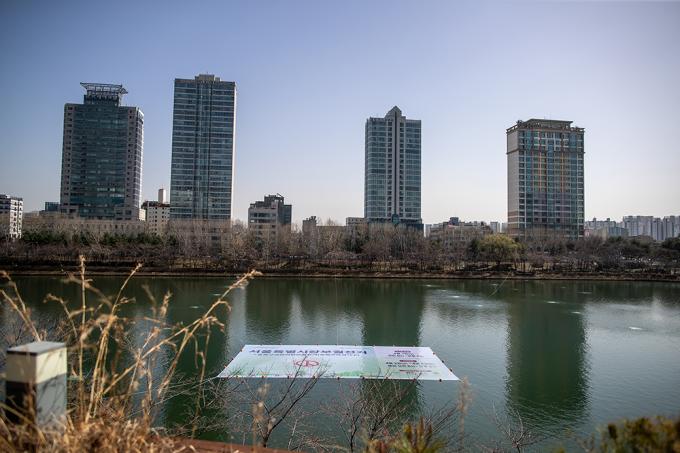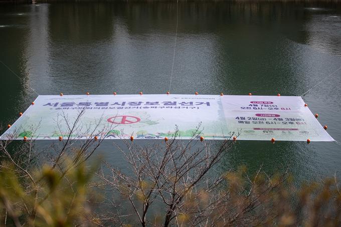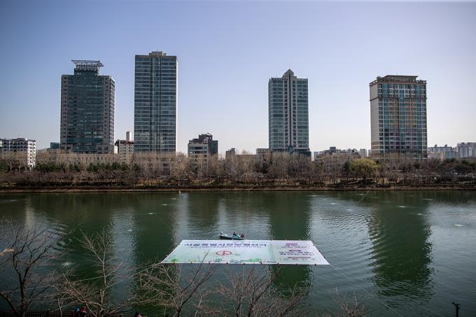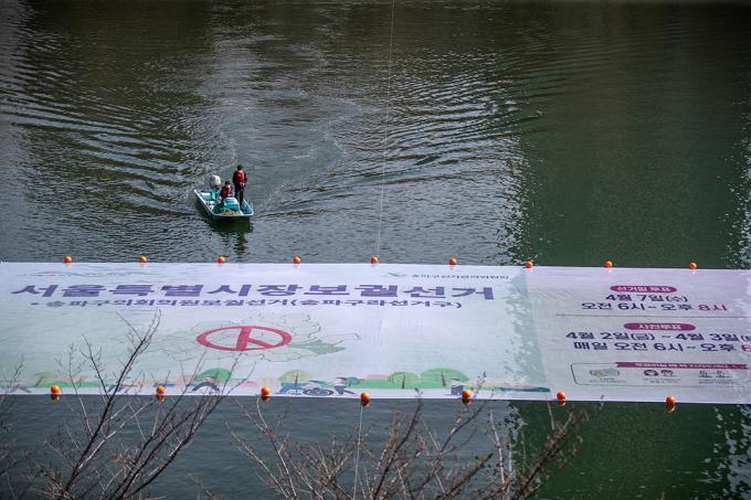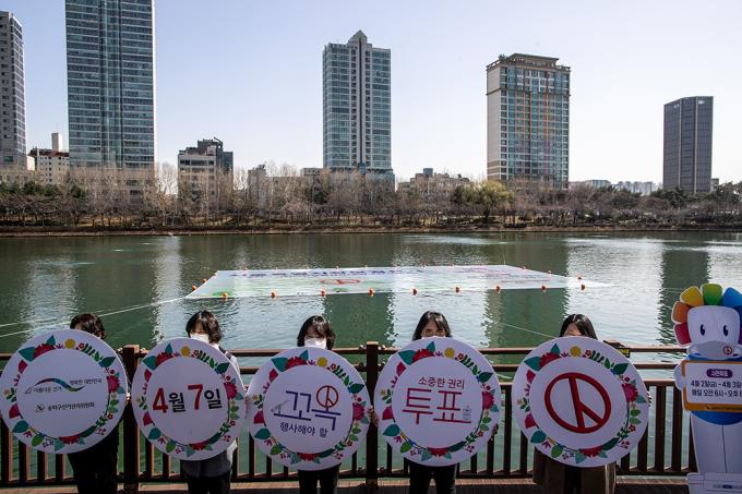 4·7 재보궐선거를 앞둔 17일 오후 서울 송파구 석촌호수에서 서울시선거관리위원회 관계자들이 재보궐선거 홍보 문구가 담긴 대형 현수막을 게시하고 있다.