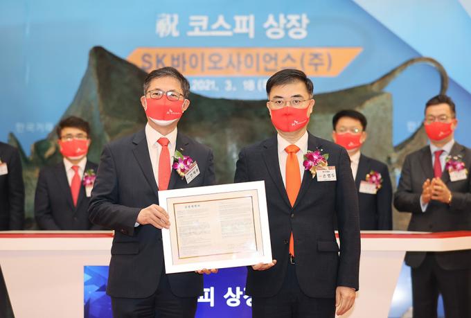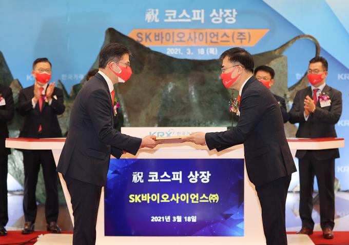 안재용(왼쪽) SK바이오사이언스(주) 대표이사가 손병두 한국거래소 이사장에게 상장계약서와 상장기념패를 받고 함께 기념사진을 찍고 있다.