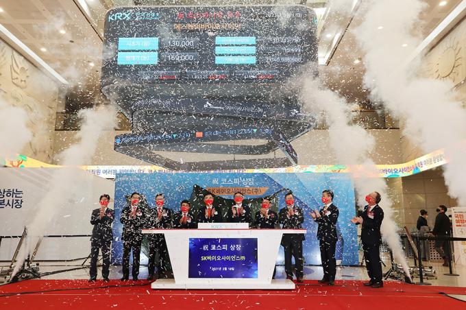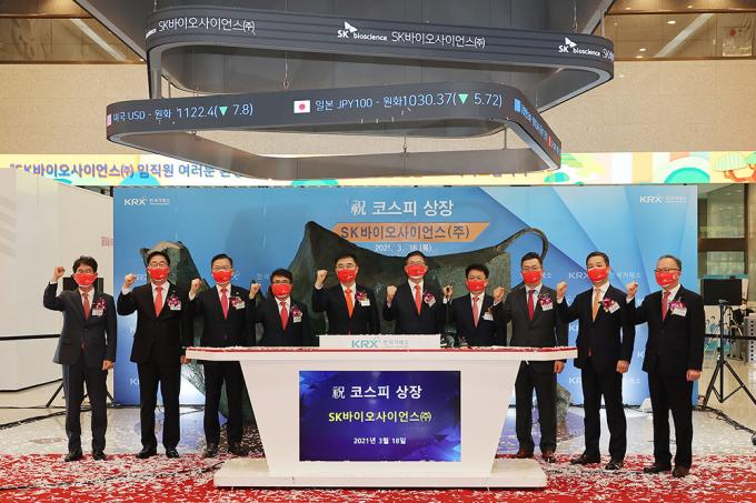 18일 오전 서울 여의도 한국거래소에서 백신 개발·생산업체인 SK바이오사이언스의 코스피 상장 기념식이 진행되고 있다. 왼쪽부터 송영훈 한국거래소 유가증권시장본부장보, 안상환 한국IR협의회 회장, 조웅기 미래에셋대우 대표이사, 임재준 한국거래소 유가증권시장본부장, 손병두 한국거래소 이사장, 안재용 SK바이오사이언스(주) 대표이사, 박찬중 SK디스커버리 사장, 정일문 한국투자증권 대표이사, 윤병운 NH투자증권 IB1사업부 대표, 김영균 상장회사협의회 전무.
