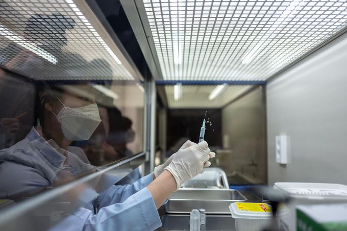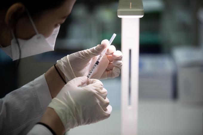 서울시 1호 코로나19 예방접종센터 운영 모의훈련이 열린 18일 오전 서울 성동구청 대강당에 마련된 예방접종센터 조제실에서 관계자가 백신 소분 조제 시연을 하고 있다.