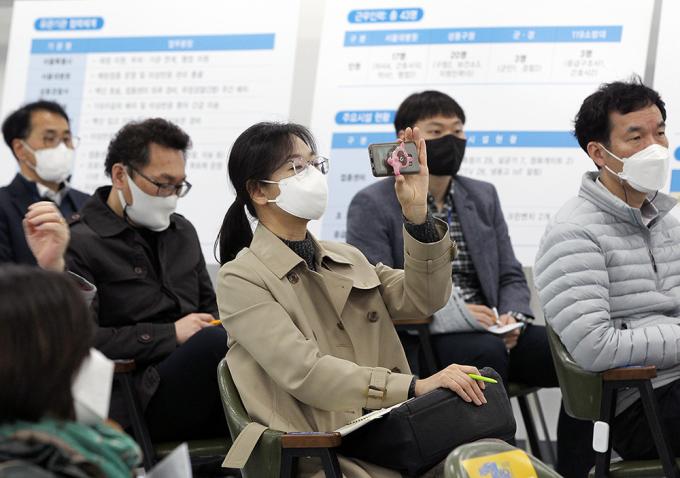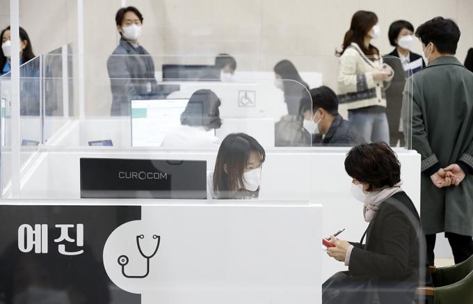 18일 오전 서울 성동구청에서 열린 서울시 1호 백신접종센터 운영 모의 훈련에서 접종대상자들이 문진표를 기반으로 예진 상담을 받고 있다.