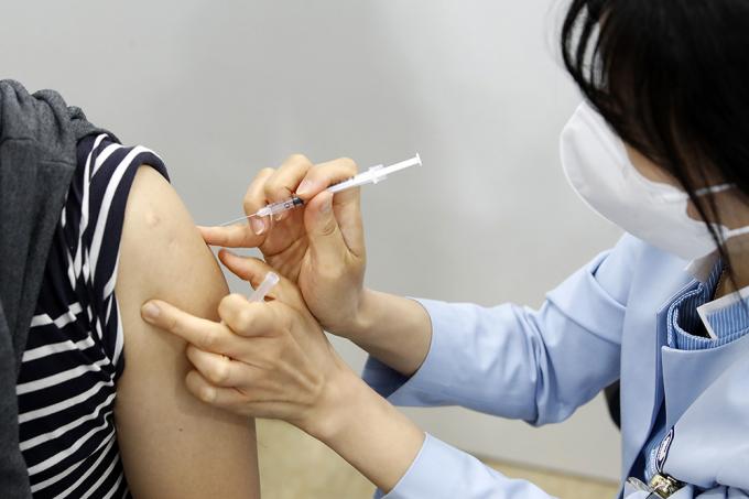 18일 오전 서울 성동구청에서 열린 서울시 1호 백신접종센터 운영 모의 훈련에서 의료진이 코로나19 화이자 백신 접종을 하고 있다.