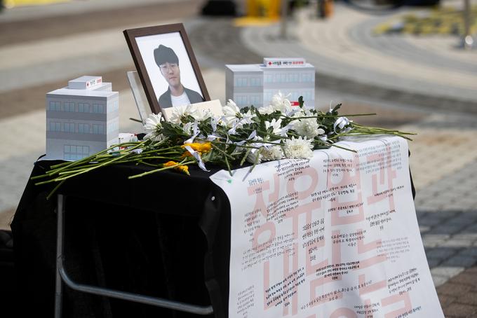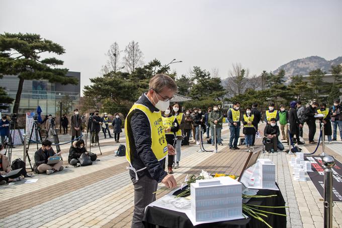 코로나19 1차 유행 당시 의료체계 공백으로 숨진 정유엽 군의 아버지 정성재 씨가 18일 오전 서울 종로구 청와대사랑채 앞 분수대에서 열린 고 정유엽 학생 사망 1년 추모 기자회견에서 영정에 헌화하고 있다.