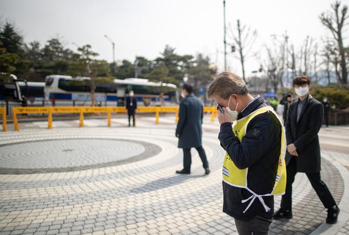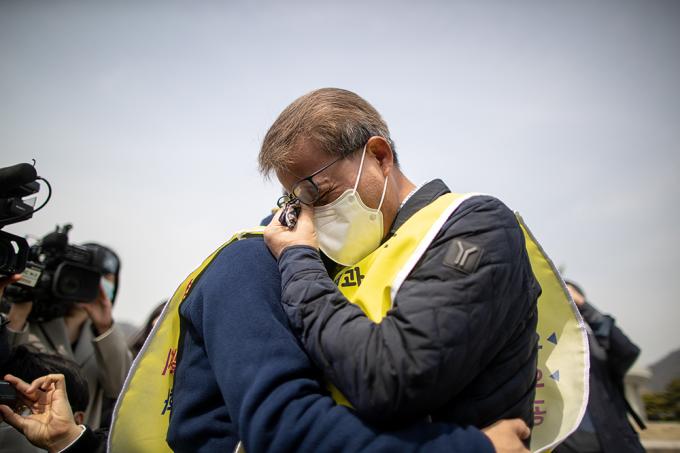 코로나19 1차 유행 당시 의료체계 공백으로 숨진 정유엽 군의 아버지 정성재 씨가 18일 오전 서울 종로구 청와대사랑채 앞 분수대에서 열린 고 정유엽 학생 사망 1년 추모 기자회견에서 눈물을 흘리고 있다. 고 정유엽 군은 지난 2020년 3월 대구에서 코로나19 1차 유행 당시 17세 나이로 세상을 떠났다. 고열과 호흡곤란에 시달려 코로나19 검사를 14번이나 받았지만 모두 음성 판정을 받아 의심 환자로 분류되어 치료도 받지 못하고 집에서 해열제로 버티다가 폐렴으로 숨졌다.