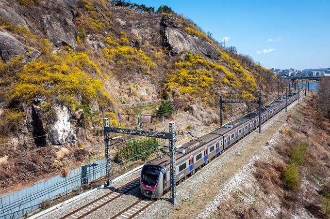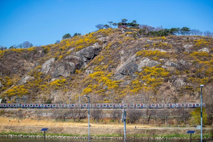 노란 개나리가 바위산을 물들이기 시작했다. 그 아래 지나는 전철이 한가득 봄기운을 싣고 오는 듯하다. 22일 한강을 내려다보는 서울 응봉산 자락 풍경은 여지없는 봄인데, 이날 아침 날씨는 심술을 부렸다. 꽃이 피고 봄이 오는게 그렇게 샘이 났을까.
