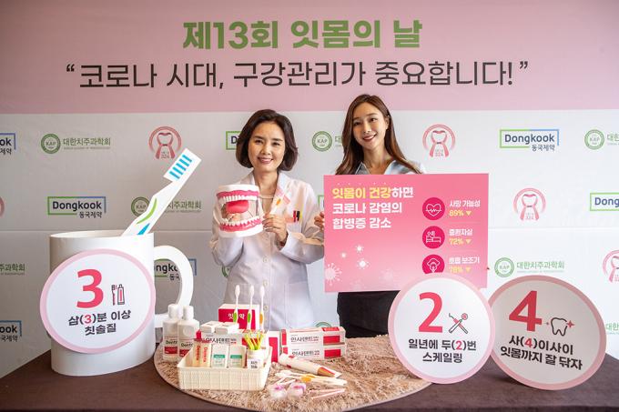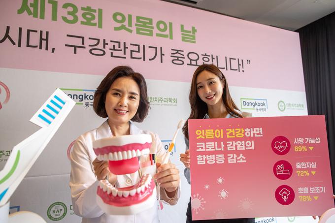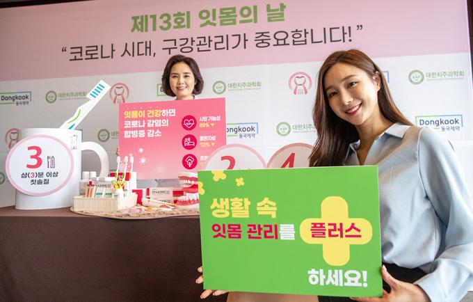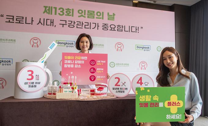 제13회 잇몸의 날을 하루 앞둔 23일 오전 서울 중구 더플라자 호텔에서 대한치주과학회와 동국제약이 '코로나 시대, 구강관리가 중요합니다'라는 주제로 캠페인을 하고 있다.