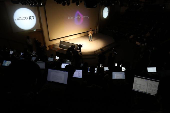 강국현 KT 커스터머부문장 사장이 23일 오전 서울 종로구 광화문 KT스퀘어에서 열린 KT 미디어컨텐츠 사업전략 발표 기자간담회에서 발표를 하고 있다.