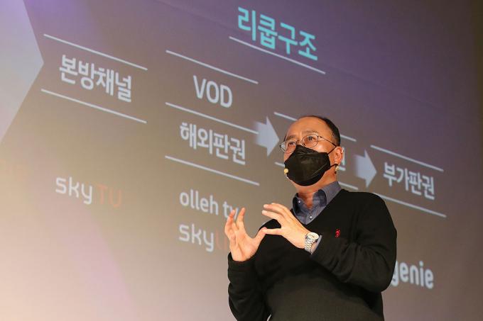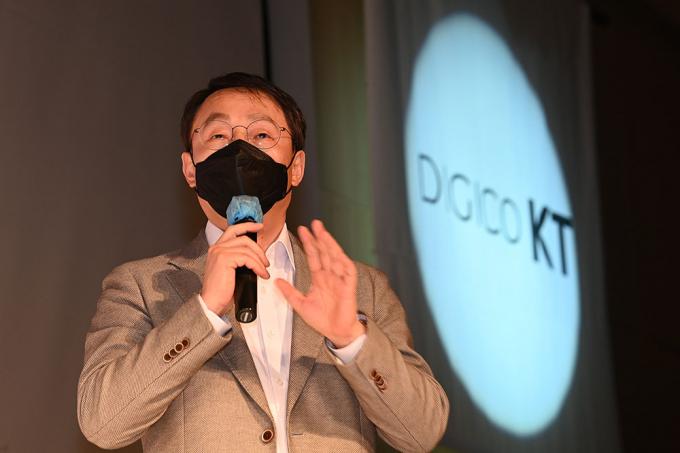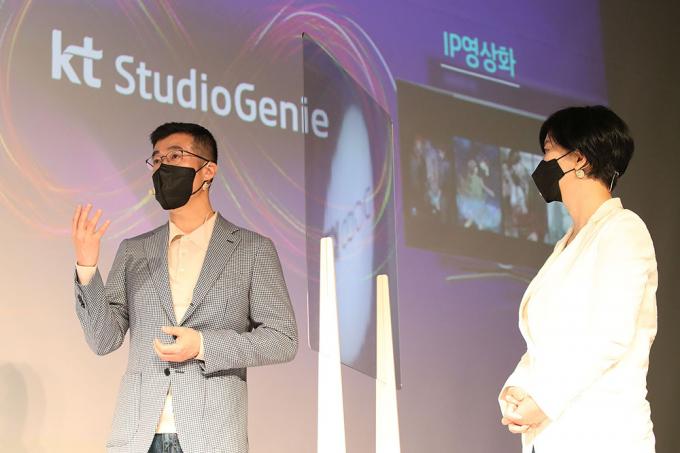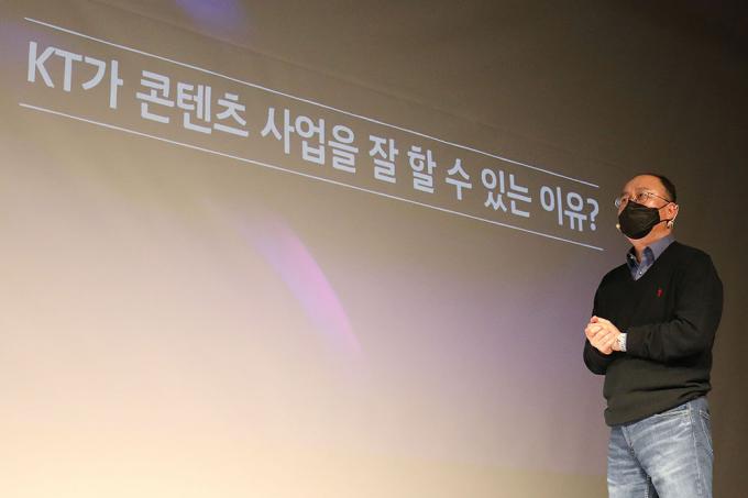 윤용필, 김철연 KT 스튜디오지니 공동 대표가 23일 오전 서울 종로구 광화문 KT스퀘어에서 열린 KT 미디어컨텐츠 사업전략 발표 기자간담회에서 발표를 하고 있다.
