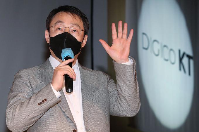 구현모 KT 대표가 23일 오전 서울 종로구 광화문 KT스퀘어에서 열린 KT 미디어컨텐츠 사업전략 발표 기자간담회에서 인사말을 하고 있다.