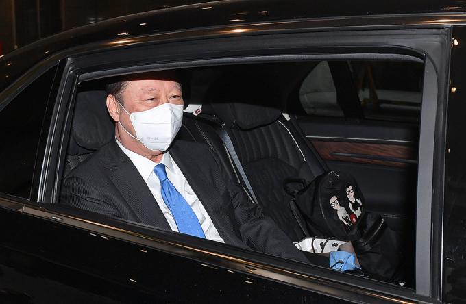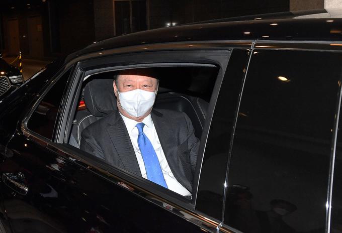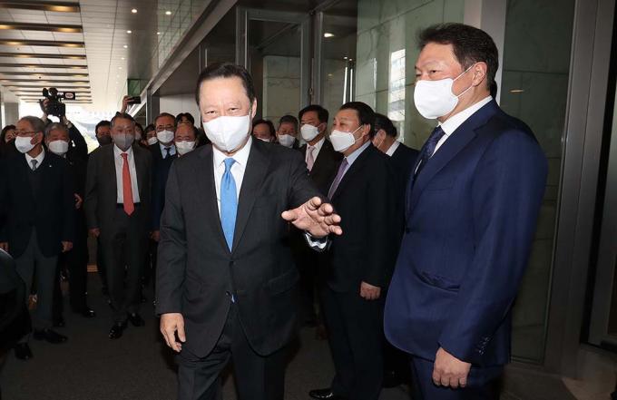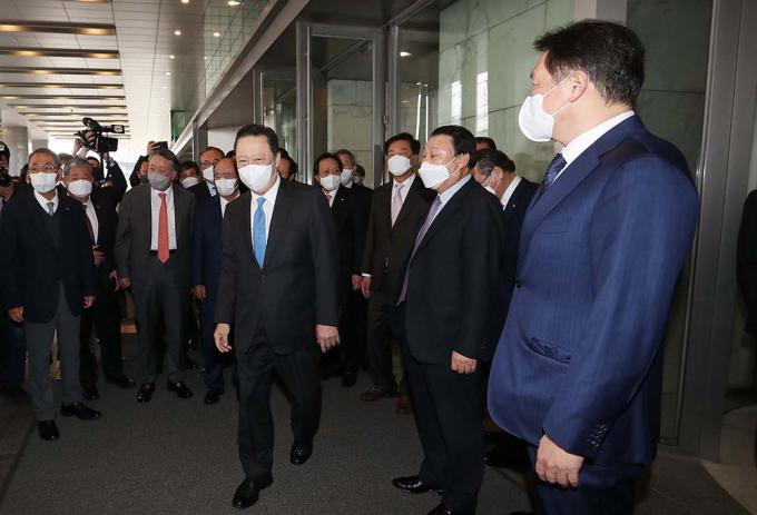 박용만 전임 대한상의 회장이 24일 서울 중구 대한상공회의소에서 열린 대한상의 의원총회에 앞서 최태원 신임 대한상의 회장 등 전국상의회장단의 환송을 받으며 떠나고 있다.