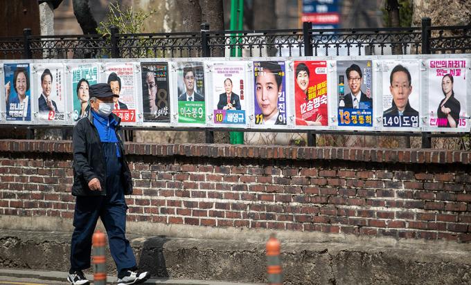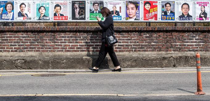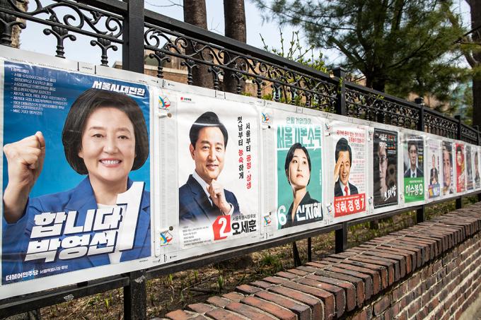 4·7 보궐선거를 앞둔 26일 서울 종로구 예술가의 집 울타리에 서울시장 후보들의 선거 벽보가 설치돼있다.